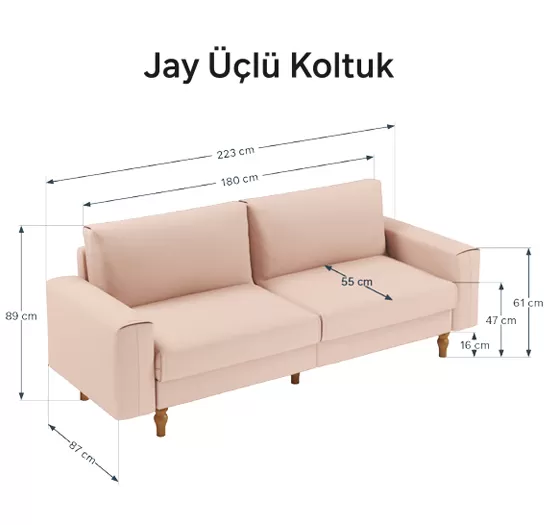 Jay Üçlü Koltuk, geniş oturma alanı ve konforlu yapısıyla evinize ferahlık katar.
