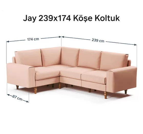 239x239 cm ölçüsüyle geniş ve rahat bir oturma alanı sunan Jay Köşe Koltuk, 65 cm ve 90 cm modüler oturumlarıyla ihtiyacınıza uygun özel ölçü köşe oluşturmanıza imkân tanır.