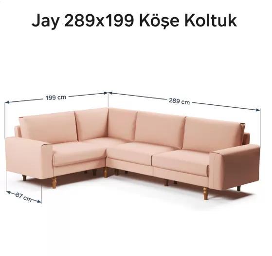 289x289 cm ölçüsüyle geniş aileler ve misafirler için ideal olan Jay Köşe Koltuk, 65 cm ve 90 cm modüler oturumlarıyla ihtiyacınıza uygun özel ölçü köşe oluşturmanıza imkân tanır.